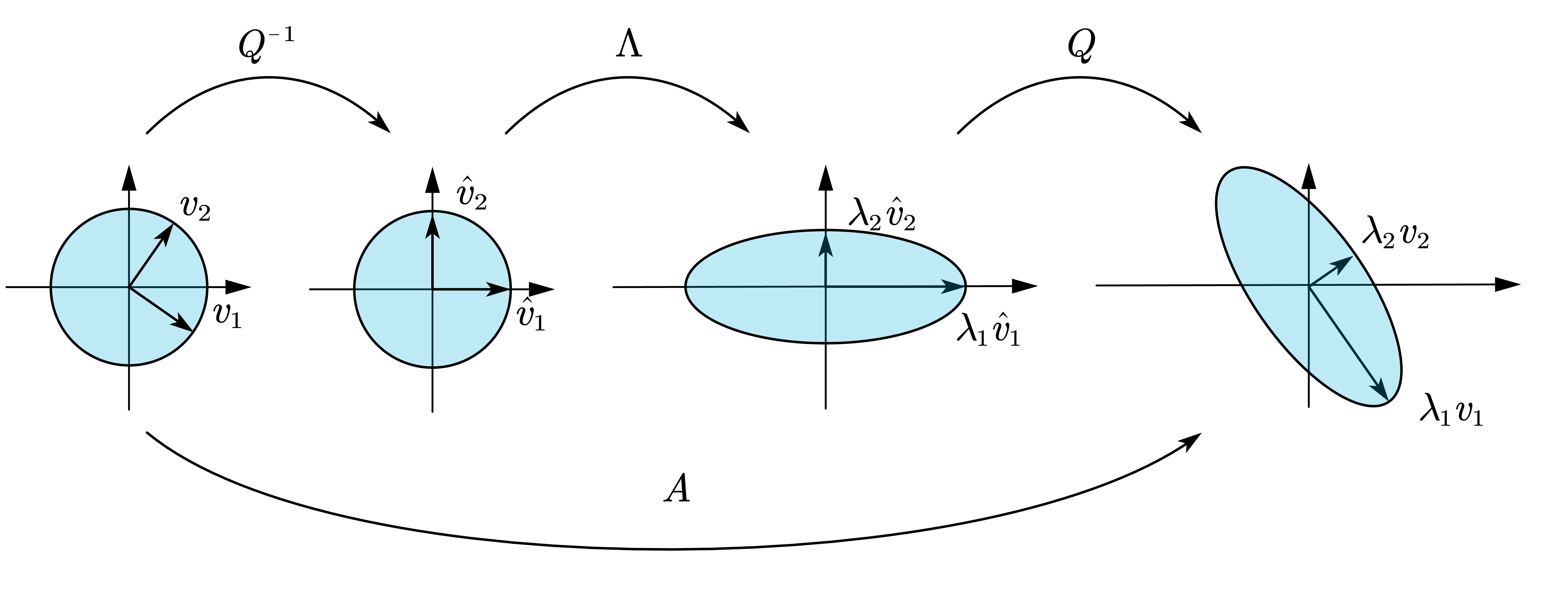 此时基的长度拉伸了倍, 旋转角度至基原来的位置.整个过程中, 基底长度拉伸了倍, 没有进行旋转. 这正与对于特征向量的变换完全一致!因此, 我们完美的解释了为什么.