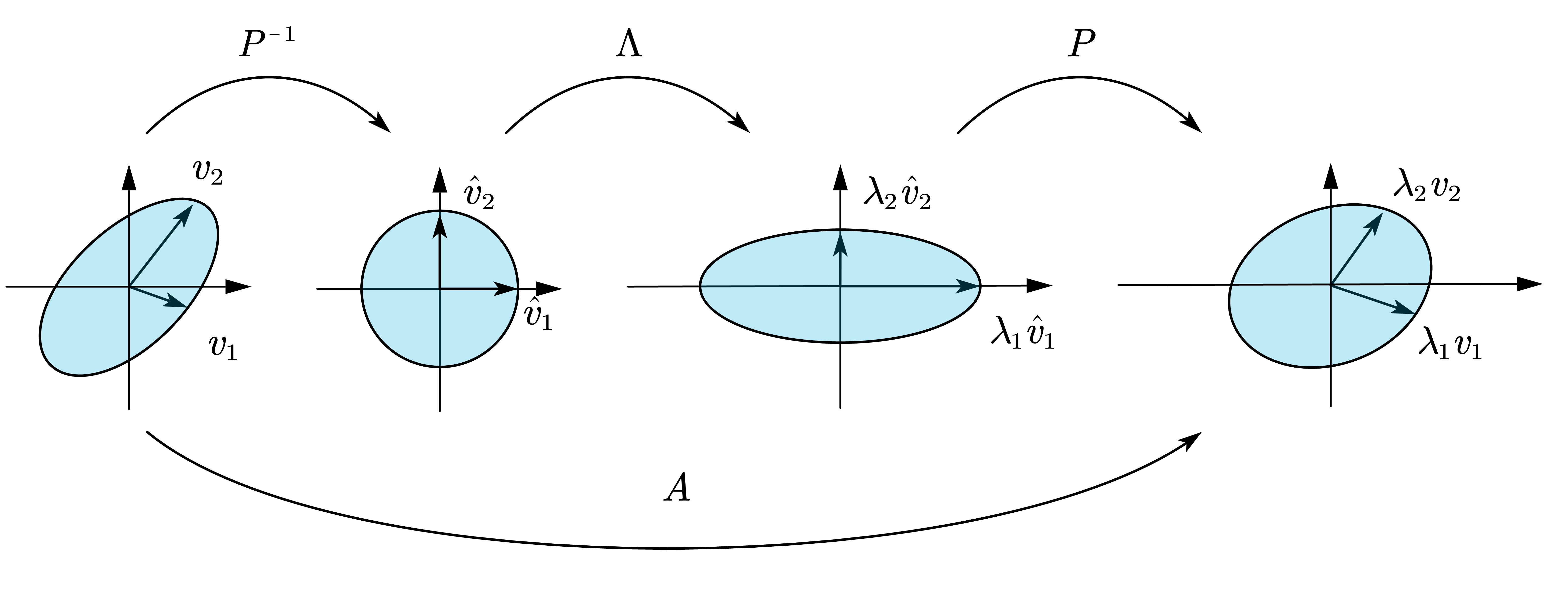 即把原本由个线性无关的特征向量组成的基底变换为标准正交基. 此时基的长度各自拉伸至倍, 旋转角度至水平垂直.第二次变换的结果是